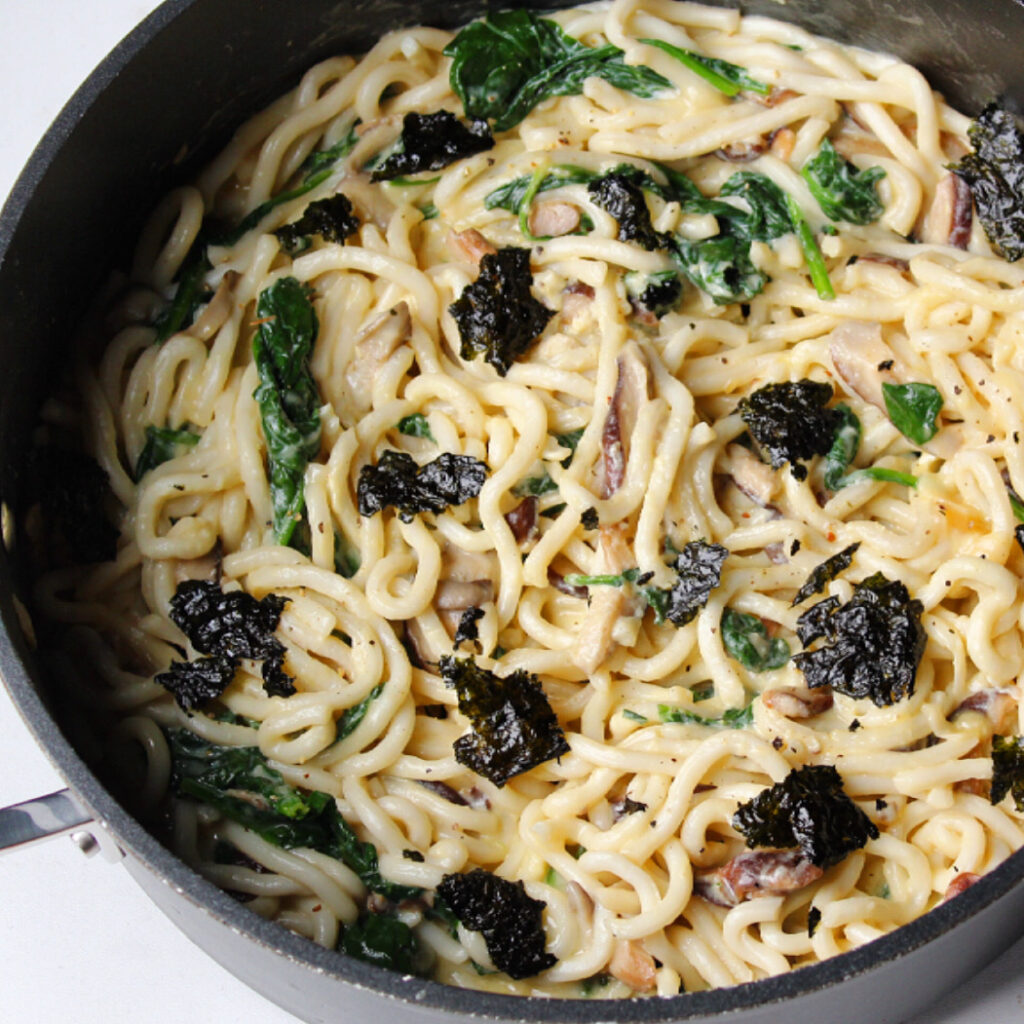 Bestrooi de noedels met versgemalen zwarte peper en verkruimel er het zeewier overheen.