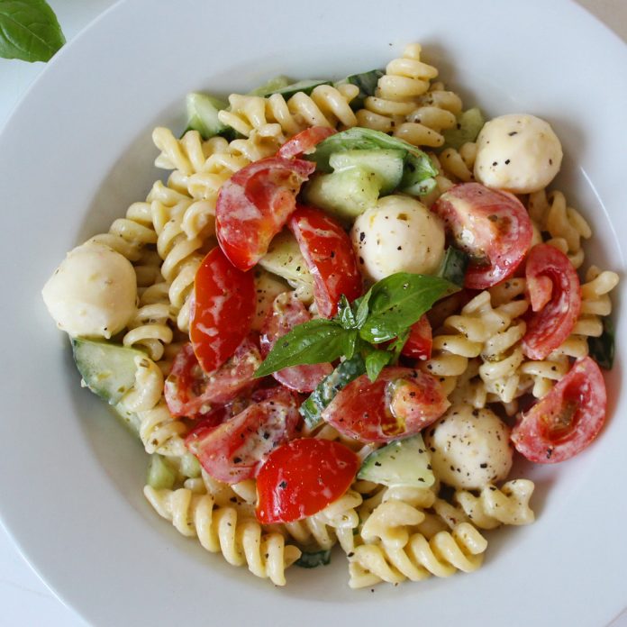 Deze simpele fusilli met pesto, cherrytomaatjes en mozzarella is lekker fris en een mooie zomerse pastasalade.