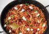 Doe ondertussen een flinke scheut chilisaus, een flinke scheut sojasaus, de crunchy pindakaas, 1 fijngesnedenĀ rode peper en een half kopje kokend water toe aan een pannetje en roer met een garde op middelhoog vuur een paar minuten door totdat er een mooie pindasaus ontstaat. Voeg eventueel nog een beetje kokend water toe als de saus te dik is. Voeg de koriander toe en breng op smaak met zout en versgemalen zwarte peper.
