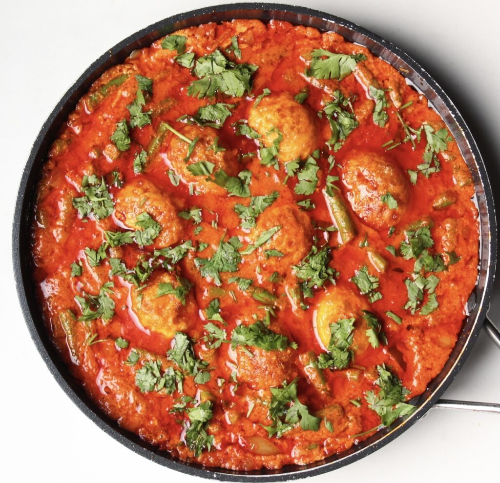 Deze heerlijke Indiase eiercurry met sperziebonen wordt op smaak gebracht met Kashmiri chilipoeder dat te koop is bij de Aziatische supermarkt.