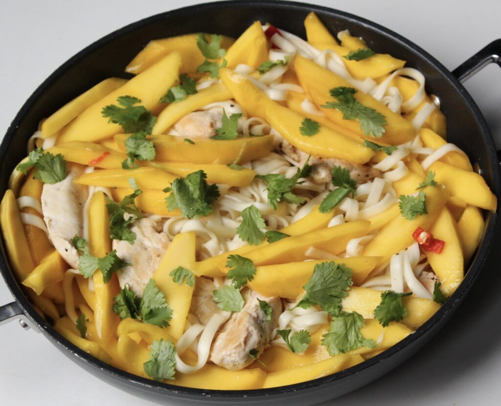 Voeg de noedels toe aan de pan met de kip en mango en meng door elkaar.