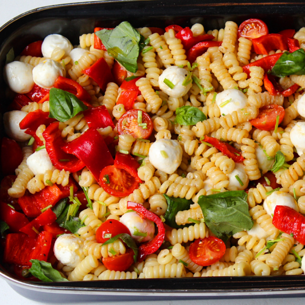 Pastasalade met cherrytomaatjes, mozzarella en kappertjes