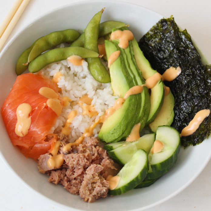 Deze supergezonde en eenvoudig te bereiden poké bowl met gerookte zalm, tonijn en avocado is altijd een topper!