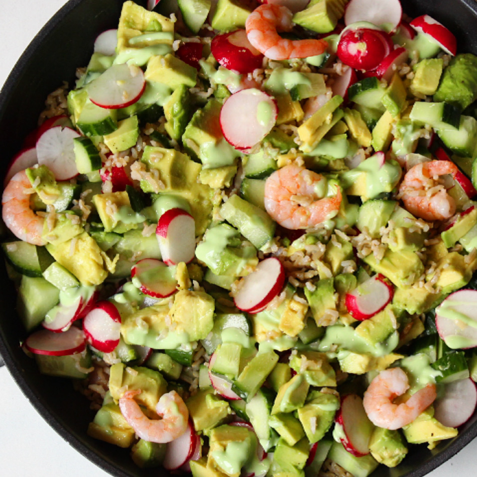 Deze supersnelle en heerlijke rijstsalade met garnalen en avocado ziet er fantastisch uit op tafel.