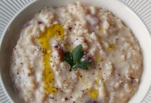 Verdeel de risotto over borden en verdeel er de kazen over. Bestrooi met de peterselie en een beetje peper.