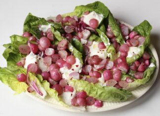 Deze frisse zomerse salade met geroosterde radijsjes en burrata is superlekker met verse ciabatta.