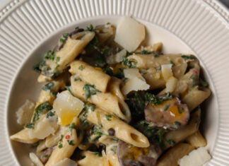 Deze smaakvolle romige penne met champignons en boerenkool is een mooie herfstpasta.