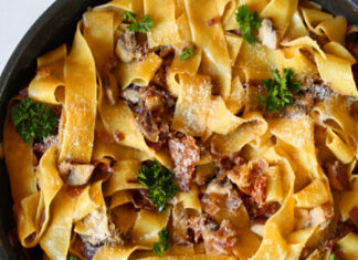 Deze pappardelle stroganoff met kastanjechampignons en Prosciutto is snel en simpel te bereiden en superlekker.