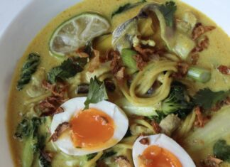 Deze Khow Suey (Birmese noedelsoep) met kip is een heerlijke smaakvolle soep op een koude winterse dag.