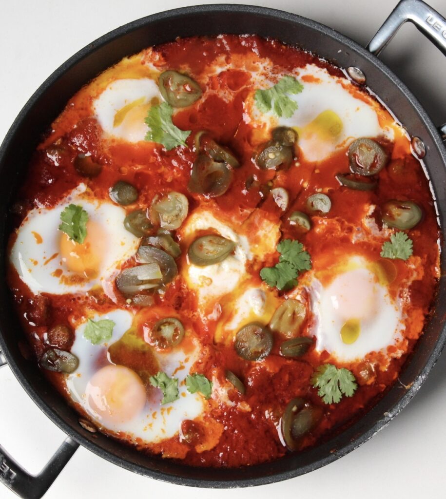 Deze pittige tomaten-harissa ragù met worstjes en ei is superlekker met knapperig brood.