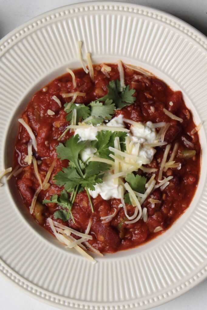 Serveer de chili met Griekse yoghurt, cheddar, koriander, limoensap, tortillachips en avocado.